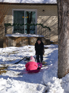 Even Piper got in on the fun.  The boys would put her on the slide and drag her up the hill.  Once, Eli accidentally let go of the rope and Piper came sliding down the hill with a huge smile on her face.  After we saw how much she enjoyed the small hill we decided to send her down the snow slide.  I'm not sure why I agreed to it but she loved it!  I couldn't believe how brave she was.  The next day the slide was icy and much faster so I didn't send Piper down.