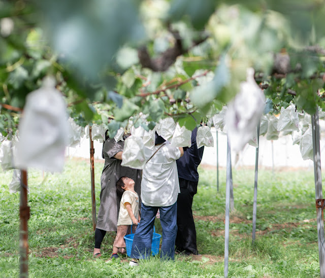 After our hike to Fukiware no Taki Falls we drove around some beautiful yellow rice fields and found a pick your own grape farm. We ended up picking three large bags of grapes. They were giant and delicious and tasted like candy. The skins are thicker so most people take the skins off. I didn't know that rice fields turned yellow and I also didn't know that grapes were covered in bags like that for picking.